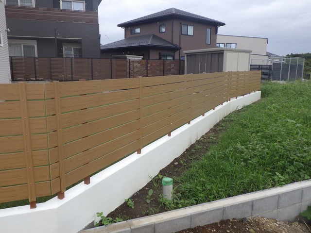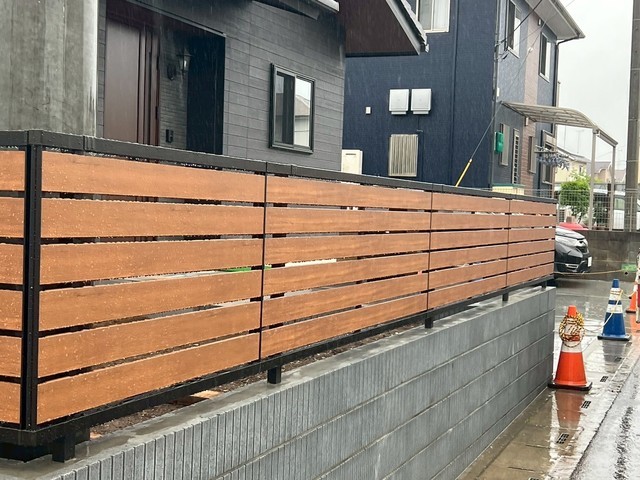 塗り壁上にマイティウッドのフェンスを設置優しいイメージになりました。