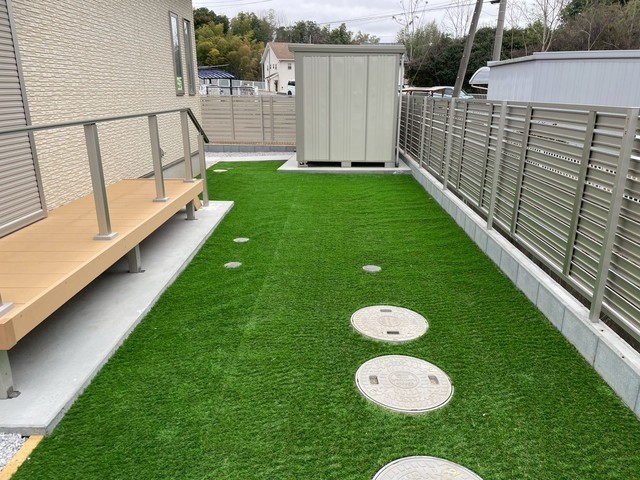 お手入れの少ないリアル人工芝となります。清潔感も持続して草も生えずらい為お勧めです。
