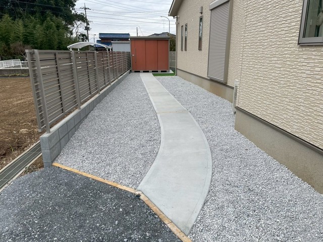 化粧砂利だけだと物置に行くのに荷物が運びづらい為、コンクリートで道を作っています。